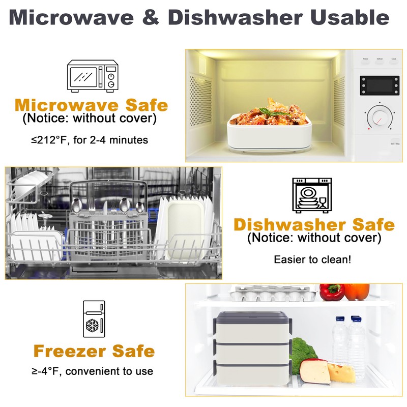 - 【Microwave & Dishwasher & Freezer Safe】The lunch boxes are microwave safe to reheat food(without cover, 2-4 mins under 212℉). The boxes are easy to clean by hand or dishwasher (without cover so no scratches). Also, the boxes are freezer safe to keep food fresh(≧-4℉). All practical designs are for families' more convenient use.