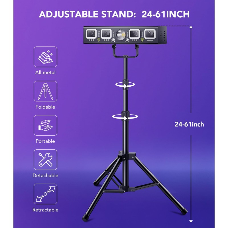 - 【DJ Lights with Stand Packages】KeoBin disco party light comes with a foldable/ detachable/ retractable tripod stand, easy to set up and teardown in mins to craft your ideal light show, cater to various occasions and covering up to 500 sq ft. Effortlessly combine laser beams, patterns, disco lights, colorful strobes, and UV lights, perfect for the gig, mobile band, wedding and dj stage
