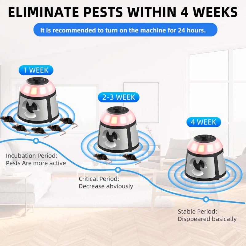 Level 3: alarm sound + flashing light (timing work 5/15/35/60 minutes cycle work), quickly repel mice