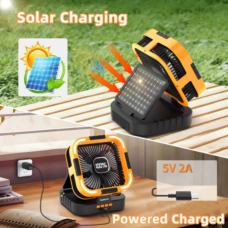 Power and Capacity: With its 10,000mAh large capacity battery, this solar fan ensures extended usage, making it suitable for camping trips or long days outdoors. Equipped with a Type-C input for charging, its USB output port allows you to use it as a portable power bank, charging your smartphone, tablet, or other devices effortlessly, and the fan can be charged in 7-8 hours