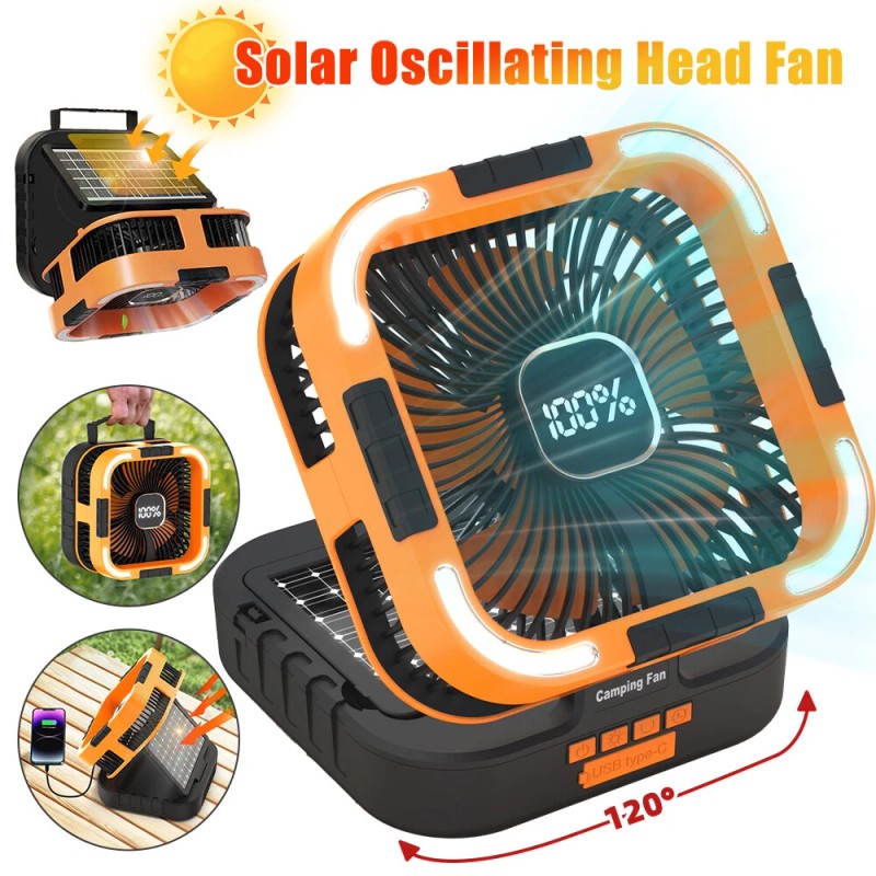 - Features: Adjustable Tilt/Head, Oscillation, Quiet Operation, Rechargeable, Timer, Solar Powered, Battery Powered, Portable, LED Light, LED Digital Display, Power Bank, 3 Lighting Modes, 6 Wind Speeds, with Handle, Shockproof, Foldable, Powerful, with Solar Panel, with Hanging Hook, Cordless, with LED Lantern