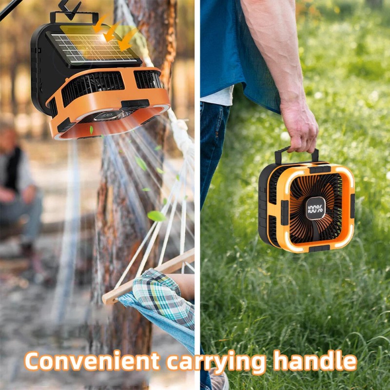 Lighting Function: The camping fan is also equipped with a lighting system available in three colours: white, yellow and a combination of yellow and white, which can be adjusted to a personalised brightness level with a long press on the dimmer,Meet the lighting needs of different scenes. Additionally, it comes with handle for easy hanging or carrying for outdoor activities
