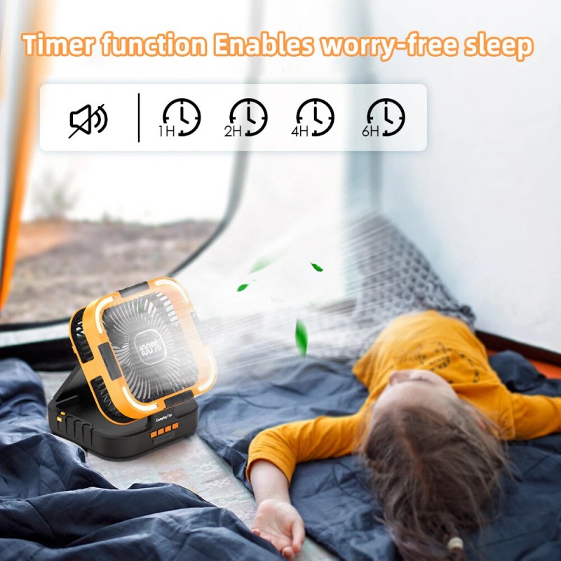 Smart and Convenient Features: Tent fan has a user - friendly digital display that shows the battery level from 0% to 100% and the current fan speed, ensuring users are always informed. Timing function can be set for 1/2/4/6 hours, and the running time can be set according to requirements