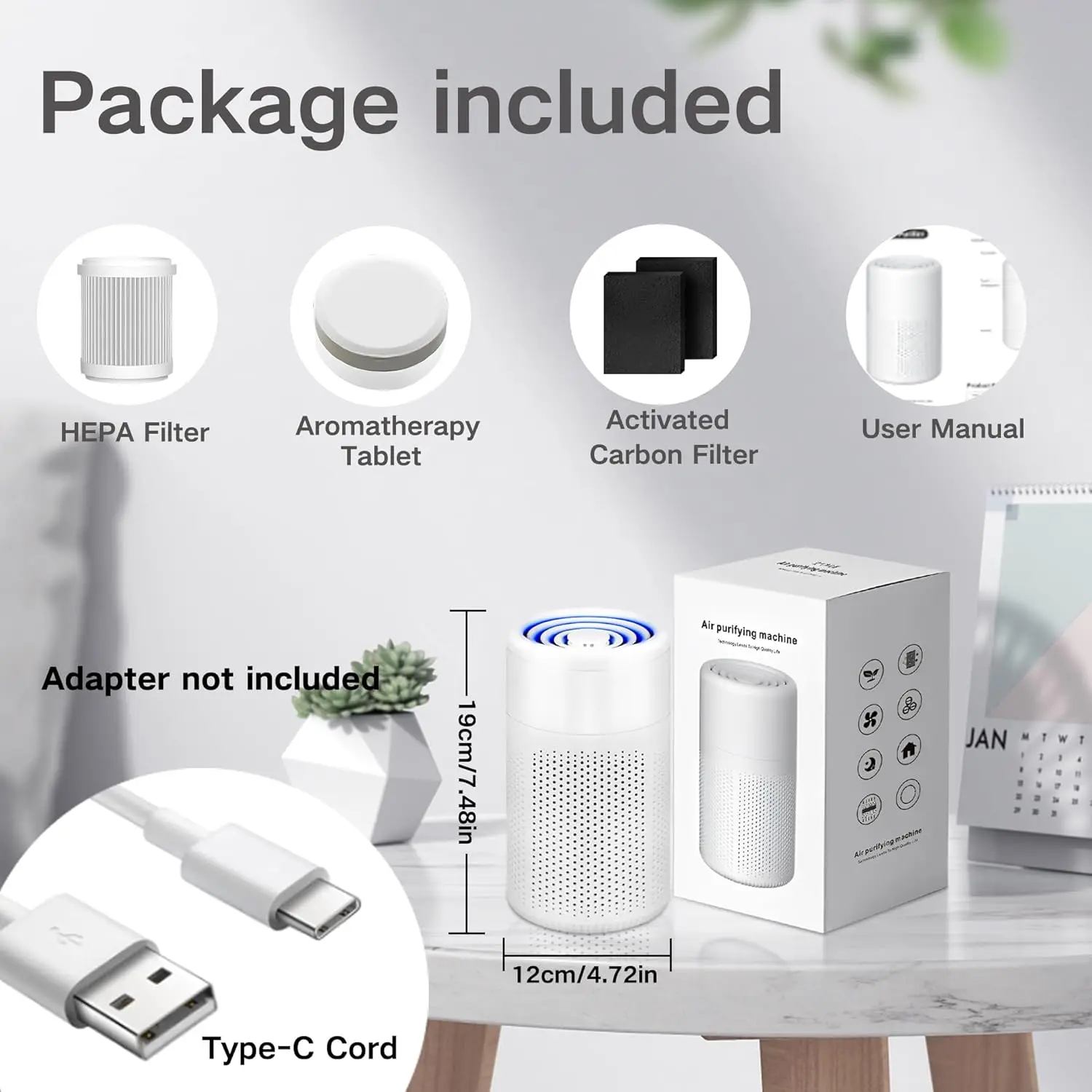【Portable Size & Wide Coverage】This small air purifier size is Ø4.3*7.5inch, weight:1.04lb/470g which is portable and charged by any USB port like power bank/laptop/any USB port. (Adapter not included) It can be conveniently placed everywhere. The air purifier covers width coverage up to 161sq.ft (15sq.m). Suitable for any space like office, bedroom, office, kitchen, living room, bathroom, small room and pet room.