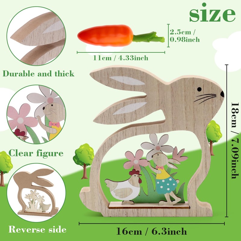 - [Package]Including wooden bunny and carrot.The wooden bunny is 15.8cm/6.22inch in length 1.8cm/0.7inch in width 17.6cm/6.93inch in height.the easter carrot is 2cm/0.78inch in width 9.5cm/3.74inch in height.