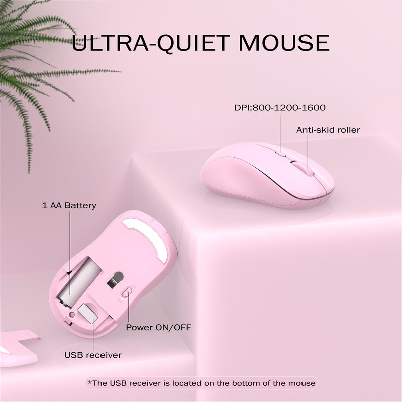 KEQTFT Wireless Keyboard and Mouse Combo, 110 Round Quiet Keys, Adjustable Optical Mouse, Share 1xUSB Receiver, Power Switch, for Windows Mac(Pink)