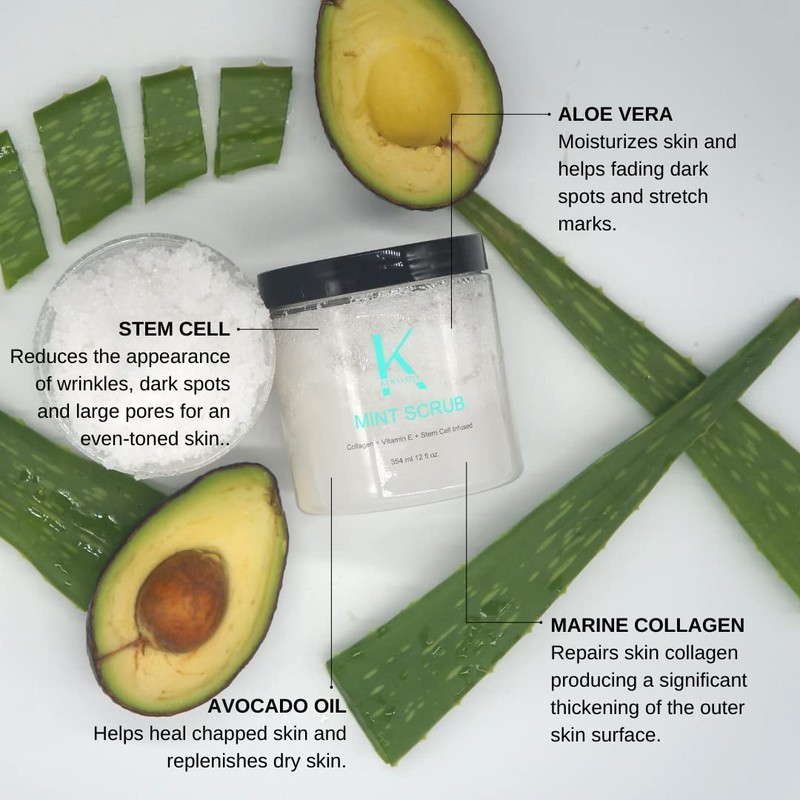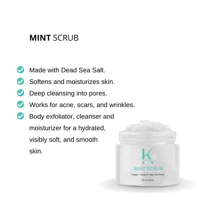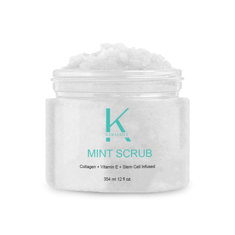 Keralove Scrub with Collagen and Stem Cells 12 oz - Exfoliating Himalayan Salt Scrub for Cellulite - Deep Cleansing for Acne, Scars, Wrinkles - Moisturizes Skin (12, Mint)