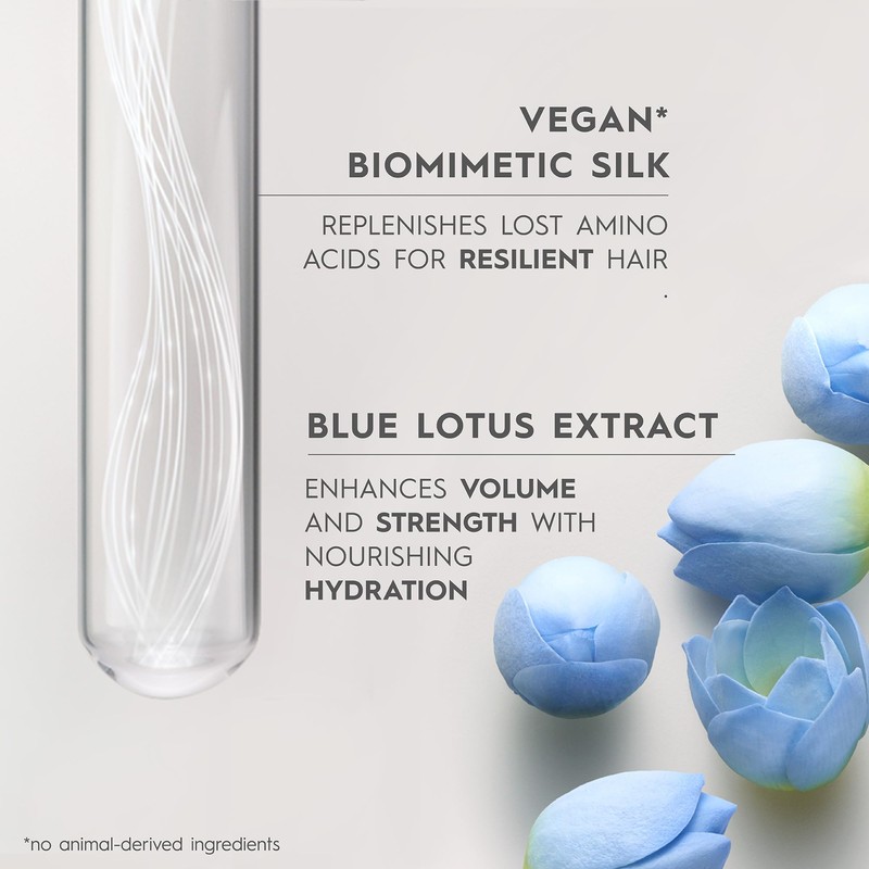 - BIOMIMETIC SILK + BLUE LOTUS EXTRACT: the formula is infused with a vegan silk that replenishes the hair’s lost amino acids, and carefully selected Blue Lotus Extract known for being rich in strengthening nutrients, minerals and vitamins, for hair with excellent style longevity and shine.
