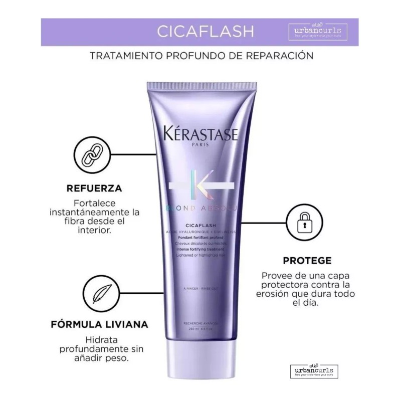 Este gel lechoso opalescente con un matiz lavanda suave ofrece la eficacia restauradora de una mascarilla con el acabado ligero de un acondicionador. Restaura intensamente el cabello sensibilizado y nutre la fibra. La combinación de Ácido Hialurónico y flor de Edelweiss alisa al instante, fortalece y suaviza el cabello decolorado sensibilizado mientras proporciona una nutrición intensa. Ideal para todos los tonos de cabello decolorado, Cicaflash restaura la fibra capilar y previene la erosión. El cabello queda suave e hidratado mientras permanece ligero y luminoso.