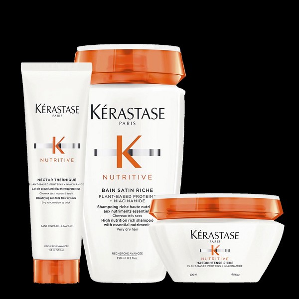 Experience the ultimate nourishment and hydration for your very dry hair with the Kerastase Nutritive Set.This luxurious bundle is specifically designed to provide intense nourishment and hydration, leaving your hair feeling soft, smooth, and revitalized. Say goodbye to dryness and hello to luscious, healthy-looking hair.What does the Kerastase Nutritive Trio for Very Dry Hair Bundle include? Kérastase Nutritive Shampoo for Very Dry Hair: This shampoo is formulated with a blend of Irisome complex and glucose proteins that work together to deeply nourish and moisturize your hair. It gently cleanses while providing essential nutrients to restore the hair's natural balance. Kérastase Nutritive Anti-Frizz Blow Dry Milk for Medium to Thick Dry Hair: This lightweight milk is designed to tame frizz and provide heat protection while blow-drying. It helps to smoothen the hair's cuticle, leaving it frizz-free, manageable, and full of shine. Kérastase Nutritive Rich Hair Mask for Very Dry Medium to Thick Hair: This indulgent hair mask is enriched with Irisome complex and lipid agents that deeply penetrate the hair fiber, providing intense nourishment and replenishment. It restores moisture and softness to dry, damaged hair, leaving it beautifully revitalized. Who is Kerastase Nutritive Trio for Very Dry Hair Bundle best for? The Kerastase Nutritive Trio for Very Dry Hair is best suited for individuals with very dry, medium to thick hair. If your hair is lacking moisture, feels rough or brittle, and is prone to frizz, this set is perfect for you. It is specifically formulated to address the unique needs of dry hair, providing intense hydration, nourishment, and manageability.