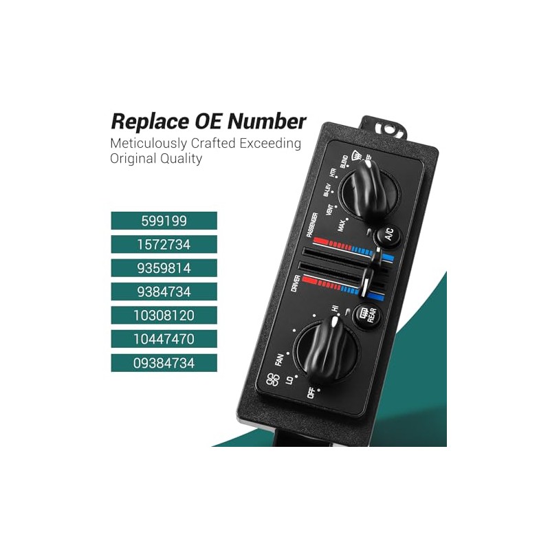 - [Quality Manufacturing]: Our air conditioning module panel climate control module is made of wear-resistant, corrosion-resistant, highly sensitive, and long-lasting ABS material. The ability to withstand temperature extremes and vibration and maintain consistent performance means less maintenance and repair costs.OEM:599199 1572734 9359814 9384734 10308120 10447470 09384734.