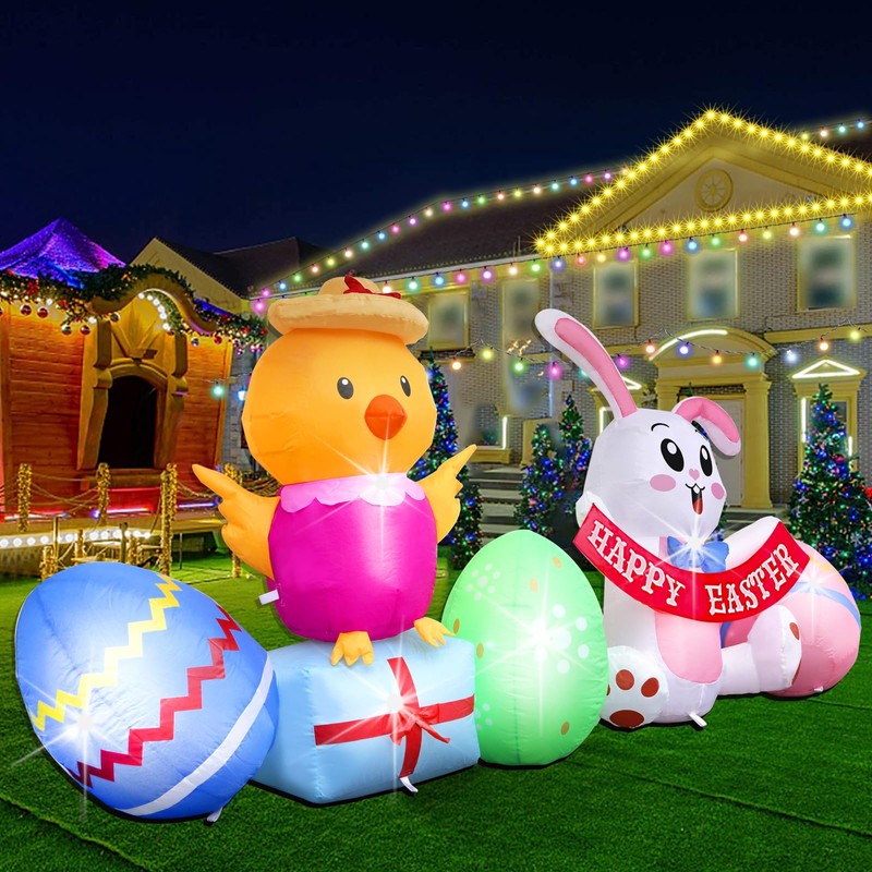 - 【 Easter Decorations Outdoor】 This inflatable easter decorations is 8.3 feet width and 4 feet tall which is the perfect size, including an Easter bunny, Chick and 3 large Easter eggs. The new magic stitching design is the classic Easter bunny with eggs elements.