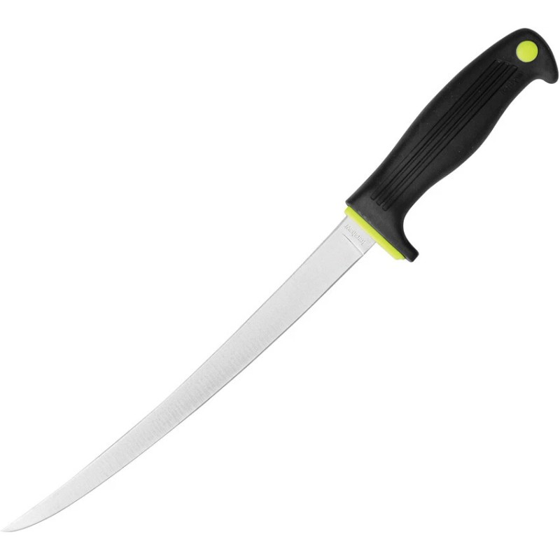 14.25" overall. 9.25" satin finish 420J2 stainless fillet blade. Black and yellow rubberized synthetic handle. Black ABS sheath. Boxed. -