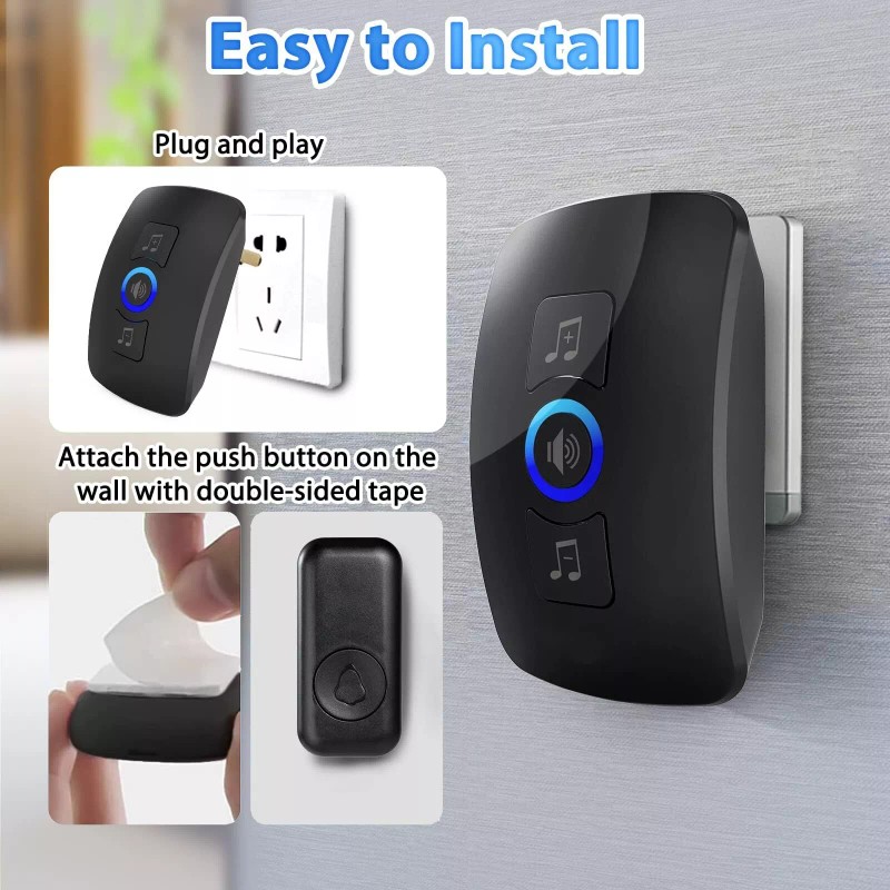 Easy To UseInstall a battery for the button then stick the button to the wall or door frame, plug the receiver into the socket, they are ready to work. |