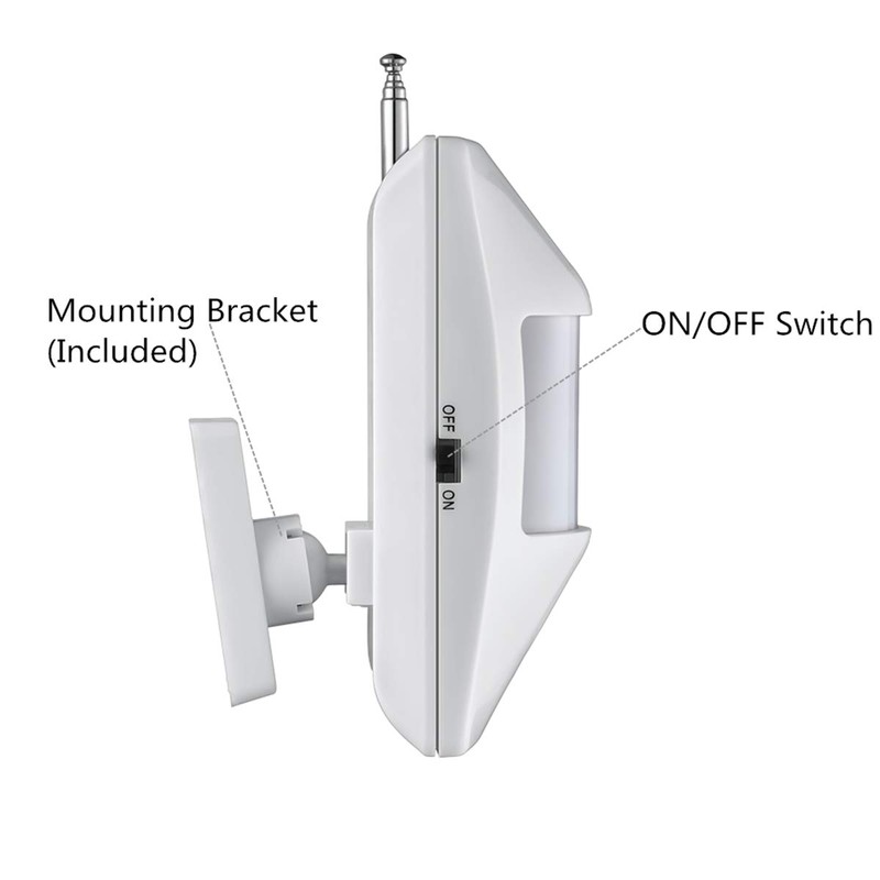 • Operates with one (1) 9V 6F22 battery (Included). ON/OFF Switch and low battery indication. After detecting motion, the sensor “sleeps” for 5 seconds, good for saving the battery.