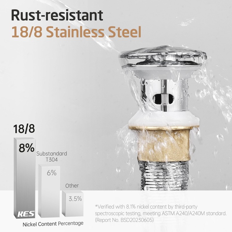• [All-metal] KES chrome pop up sink drain is crafted from premium SUS304 stainless steel and brass, ensuring exceptional durability.