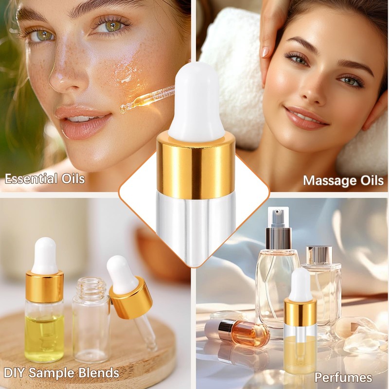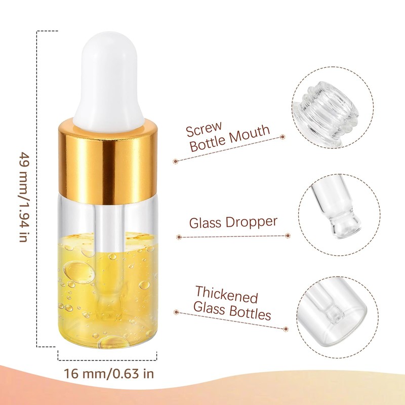 - Package Included: 15 pcs 3 ml clear dropper bottles with gold cap and white rubber tip. Glass bottle with dropper for easy dispensing of essential oils, perfumes or samples