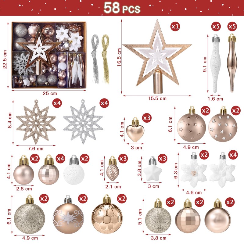 - DETALLES DEL PRODUCTO: un conjunto de 58 adornos navideños, hay 58 bolas temáticas diferentes. Es el tamaño más común para Navidad, adornos de árbol de Navidad, cada adorno está equipada con una hebilla colgante, que es muy fácil de colgar en su abeto