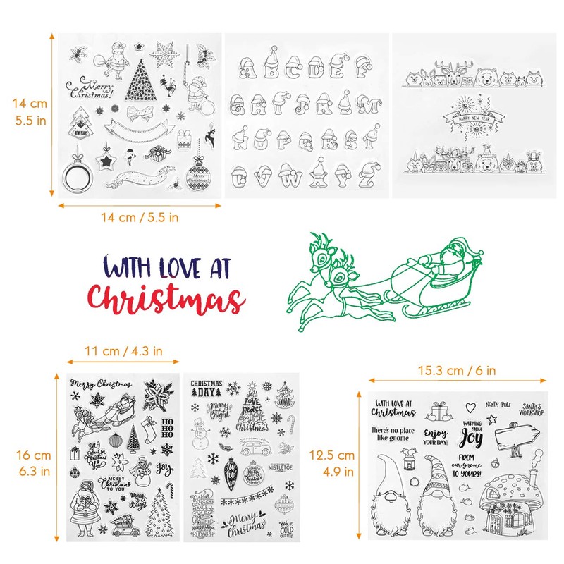 - Christmas Stamps 6.5 x 4.5 inches, 5.7 x 5.7 inches, 6.3 x 5.1 inches, made of silicone, transparent, reusable