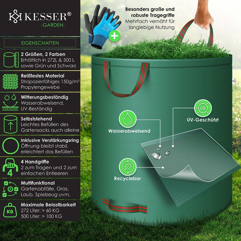 - Robust material: the KESSER garden bag is not only a simple bag for garden waste, but a versatile and robust tool for everyday use in the garden, on the farm or in the workshop. It offers a generous capacity of 272 litres or 500 litres to carry large amounts of waste or materials. Thanks to the durable 150 g/m² propylene fabric, it remains stable and tear-resistant even under heavy loads.