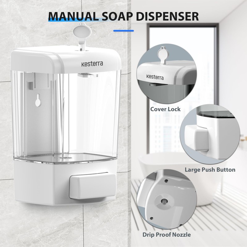 KESTERRA Manual Soap Dispenser, 23.7oz/700ml Wall Mount Soap Dispenser, Large Capacity Kitchen Bathroom Hand Soap Dispenser, Shampoo Shower Gel Dispenser Lotion, White