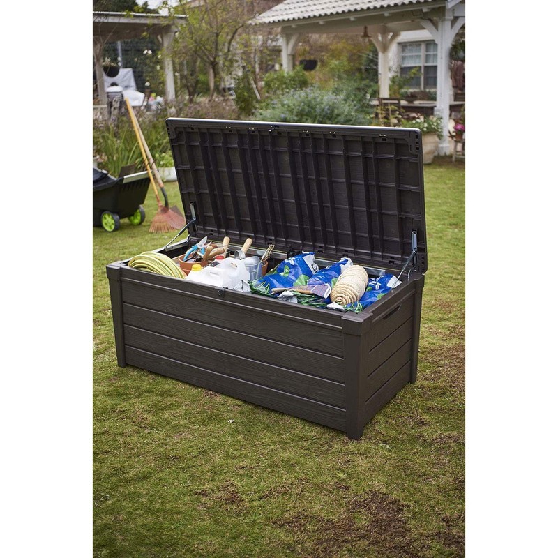 Your deck or patio is an important extension of your home. Some of the best memories are made over steaks on the grill, neighborhood pool parties, and outdoor family gatherings. Make your outdoor living space tidy and appealing with a sturdy, attractive deck box from Keter Plastic. Store all your outdoor essentials in one easily accessible container that blends seamlessly into your home's outdoor decor. Designed to suit the breezy, spontaneous style of outdoor living, the Keter Brightwood storage box allows you to toss furniture cushions, table covers, cleaning supplies, pool or beach toys and other outdoor accessories into a handy container for quick retrieval when you need them. Why make constant trips to the garage or storage shed when you could have instant access to everything you need? Key Features: External dimensions: 57 inches x 27. 5 inches x 23. 7 inches Internal dimensions: 54. 3 inches x 23. 5 inches x 21. 7 inches Storage capacity: 120 Gallons Stylish wood-paneled design Doubles as a comfortable seat for two adults Weight capacity: 804 lbs. Automatic opening mechanism makes opening and closing easy Built-in handles for movability Lockable lid for extra safety and security Ventilated interior Weather-resistant, waterproof and UV protected Will not warp, dent, rust or peel Never needs painting Easy to assemble Made from polypropylene resin plastic to ensure its durability
