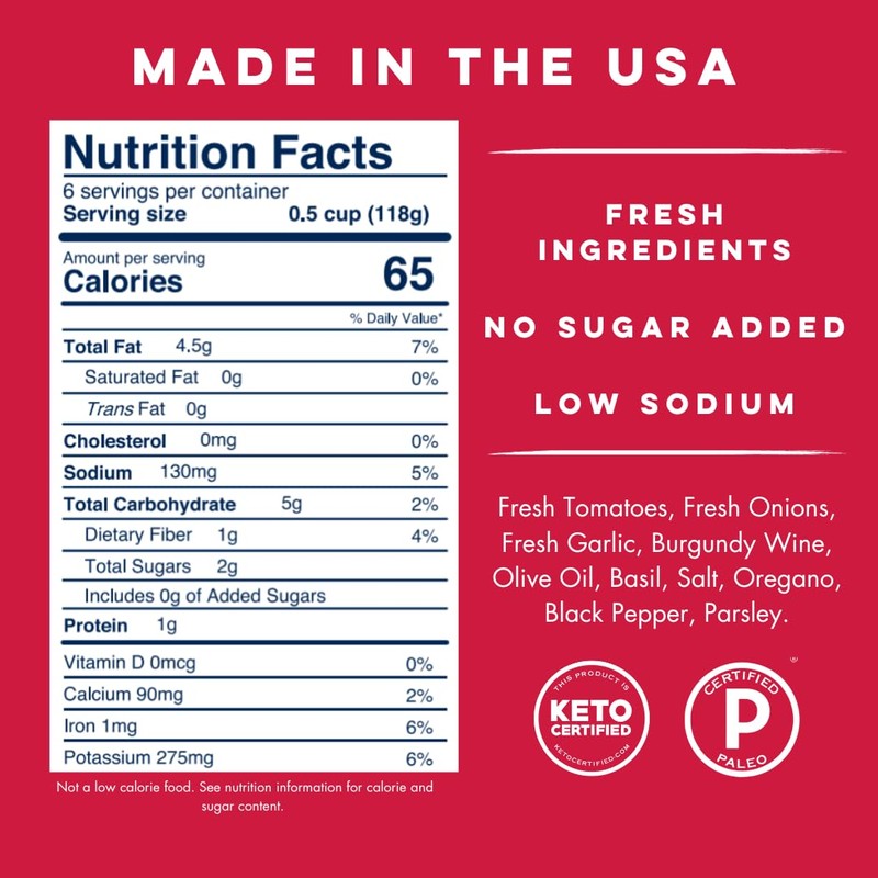 - ALL OF THE PLEASURE, NONE OF THE GUILT. With only two grams of natural sugar per serving, our customers report using our gourmet natural pasta sauce as part of their Keto, Paleo, Whole 30, Low Glycemic, and Low Carb Diets! Unlike the competition, our sauces are made from only whole, natural ingredients, so you can rest assured that they are as slimming and healthy as they are indulgent.