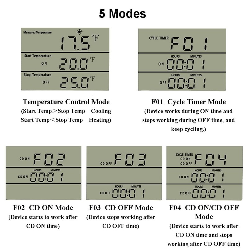 - 【Timing function】 F01 Cycle Timer mode; F02 Countdown ON mode, F03 Countdown OFF mode, F04 Countdown ON and Countdown OFF mode. You can choose F01 mode to control the device to work in cycles, or choose F02~F04 modes to countdown to turn on or turn off the device. Set range: 0~99 hours 59 minutes. Please note that temperature control function and timing function cannot be used at the same time.