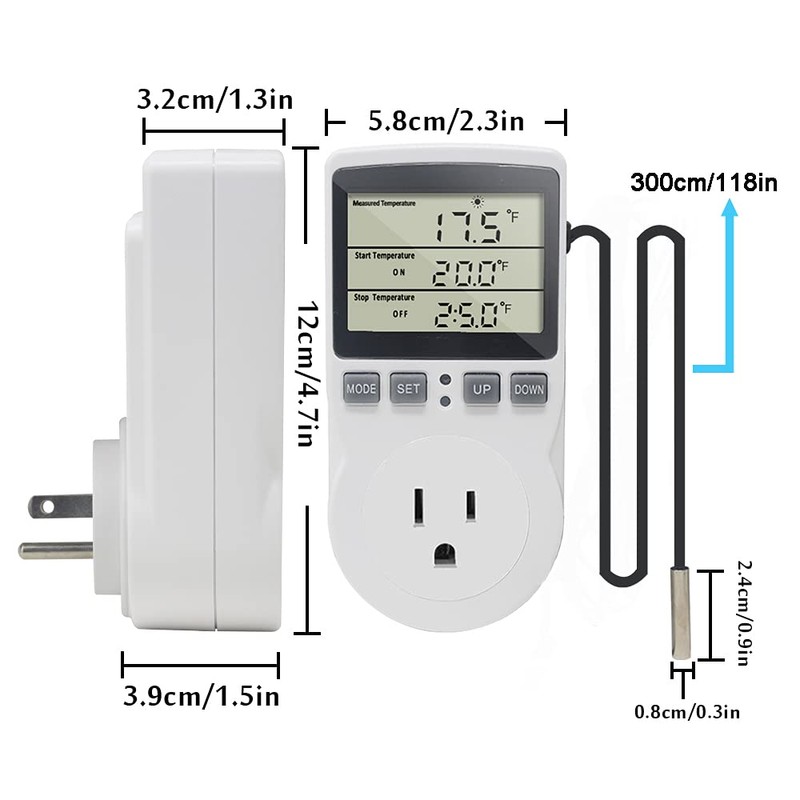 - 【Easy to program】 Just set start temperature and stop temperature, this plug in thermostat will work in heating or cooling mode. Temperature control range:-40℉~248℉(-40℃~120℃), temperature control accuracy: ±1%. Celsius and Fahrenheit can be converted. This digital temeprature controller also supports temperature calibration if needed.