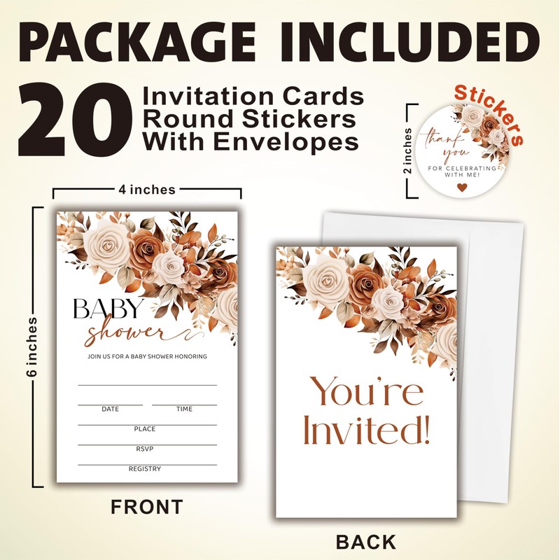 Ketsord 20 Baby Shower Invitations & Thank You Stickers - Fall Boho Floral Invites, Envelopes And Adhesive Round Thank You Stickers, Gender Reveal, Baby Announcement Party Favor (A05)