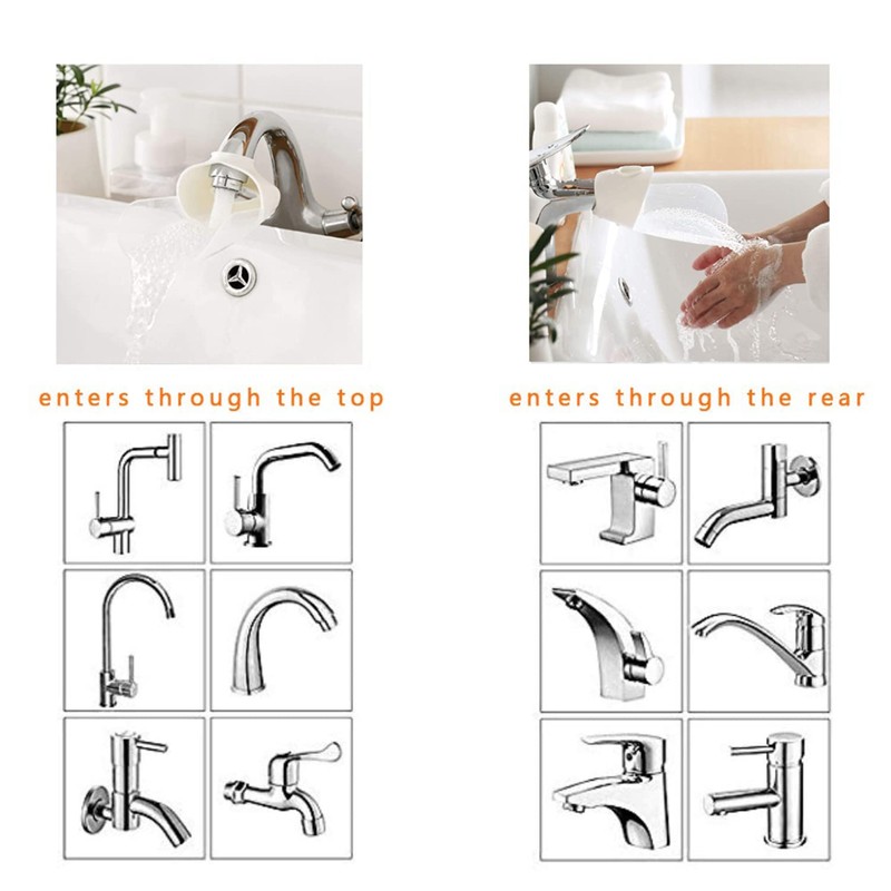 2. Two entry holes make it fit for both straight channel water tap and goose neck type taps. That fits almost all faucets, whether it's washing hands after potty training, helping wash the veggies for dinner, or washing before dinner at Grandma's house.