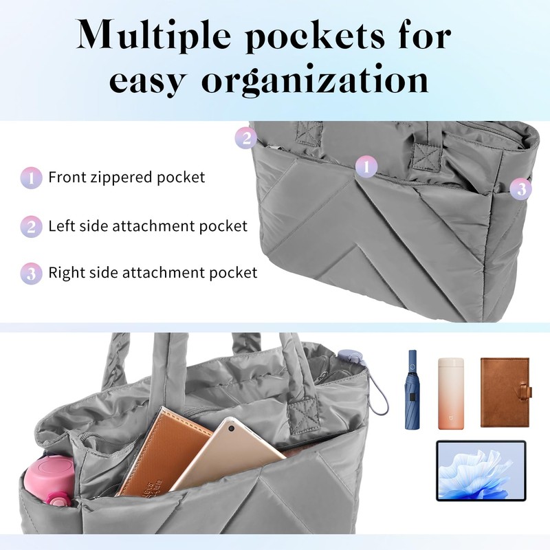 Keureedg Tote Bag for Women, Puffy Work Handbag with Zipper Travel Tote Bag Organizer for Women with Compartments Lightweight Shoulder Bags for Travel Work Teacher Nurse Gym, Grey