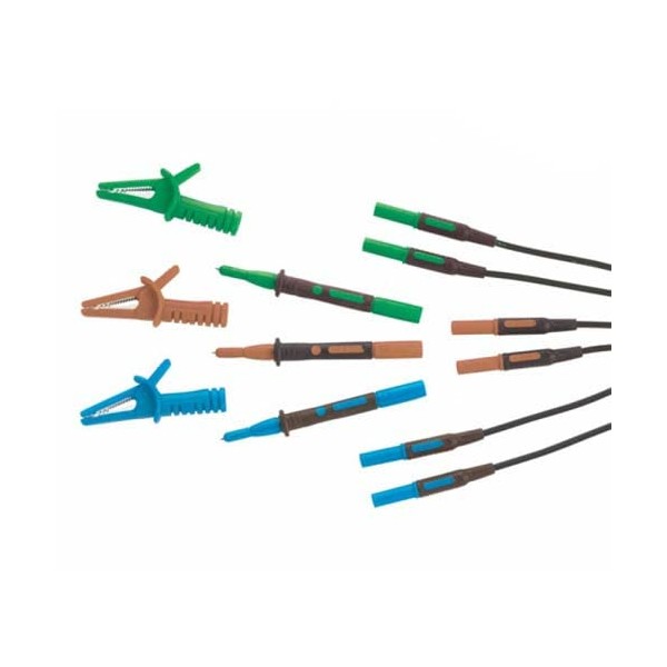 Strong G7 distribution board leads with 4mm connectors Fits all major brands of testers KEY BENEFITS Universal G7 test leads fit all major brand testers KEY FEATURES Strong G7 distribution board leads Tested for pull out, bending, strain relief and temperature performance gives reliable performance High performance croc clips gives excellent testing consistency 1 x 3 wire distribution board test lead Universal 4mm connector for instrument 3 x probes 3 x croc clips