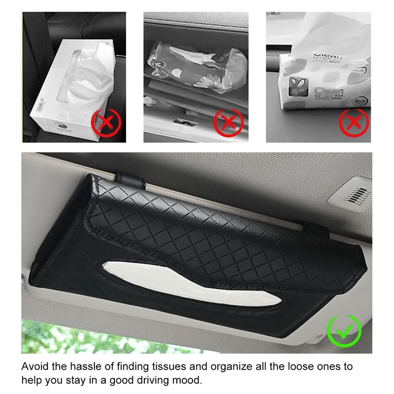 - 【Reliable Quality】: This car visor tissue holder is made of high quality microfiber leather. It is soft and smooth, and feels comfortable to the touch. It is wear-resistant and tough, not easy to break or get worn out. It has a waterproof surface that is easy to clean and can be gently wiped with a wet towel.