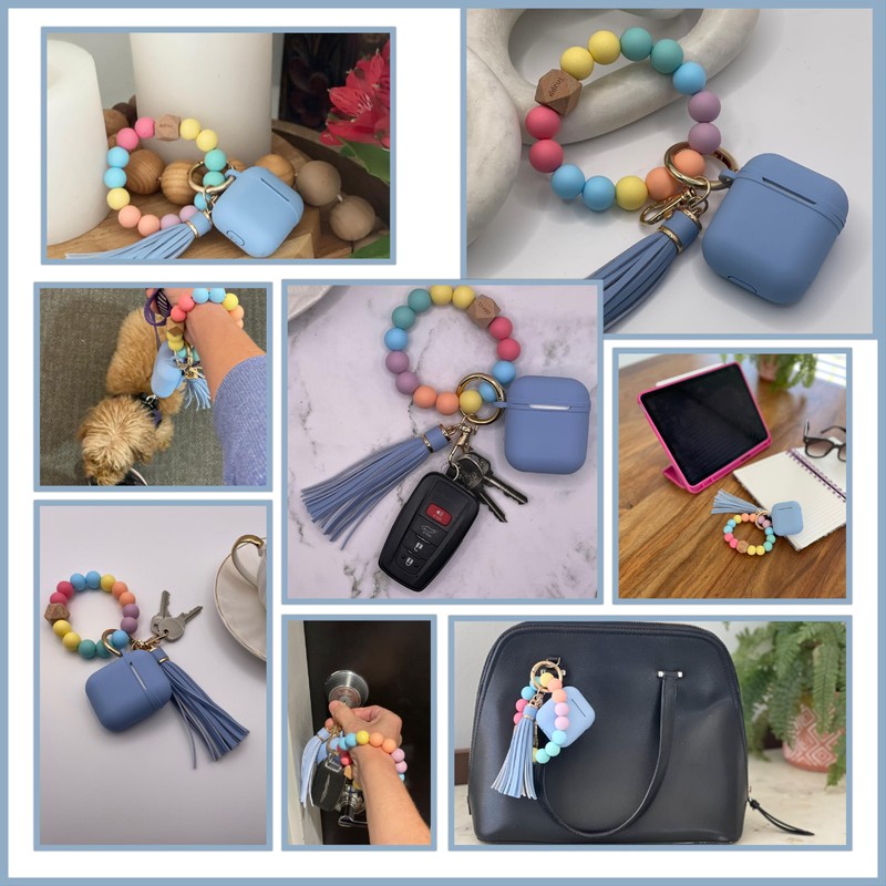 Key Chain Bracelet Wristlet Silicon Beaded Key Ring Keys Holder Bangle Bracelet with AirPod Case Compatible with AirPods 2nd 1st Generation for Women, Girls (Light Blue)