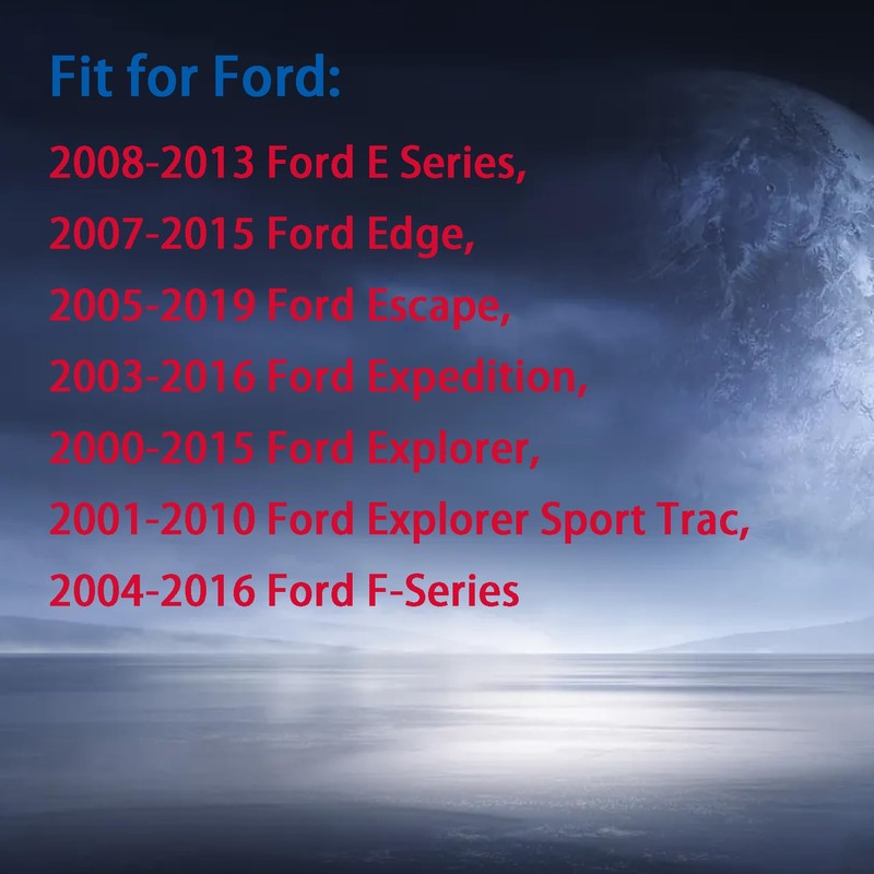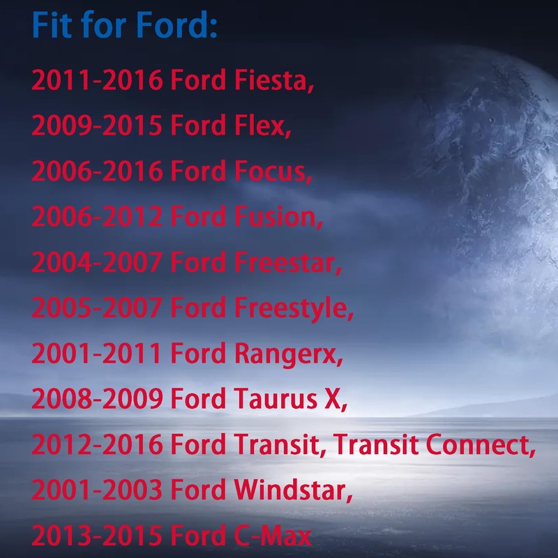 Fit for Ford: 2011-2016 Ford Fiesta, 2009-2015 Ford Flex, 2006-2016 Ford Focus, 2006-2012 Ford Fusion, 2004-2007 Ford Freestar, 2005-2007 Ford Freestyle, 2001-2011 Ford Rangerx, 2008-2009 Ford Taurus X, 2012-2016 Ford Transit, Transit Connect, 2001-2003 Ford Windstar, 2013-2015 Ford C-Max, 2008-2013 Ford E Series, 2007-2015 Ford Edge, 2005-2019 Ford Escape, 2003-2016 Ford Expedition, 2000-2015 Ford Explorer, 2001-2010 Ford Explorer Sport Trac, 2004-2016 Ford F-Series
