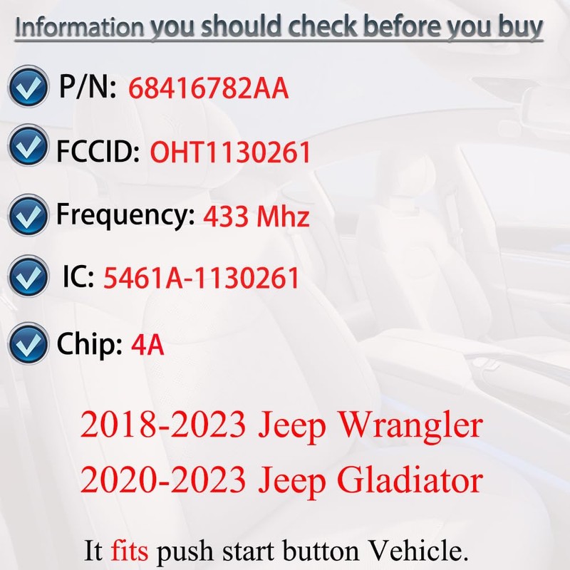 - 【Replacement 】For Remote fob P/N: 68416782AA; FCC ID:OHT1130261; Key Fob Replacement Suitable for 2018-2023 Jeep Wrangler / 2020-2023 Jeep Gladiator.