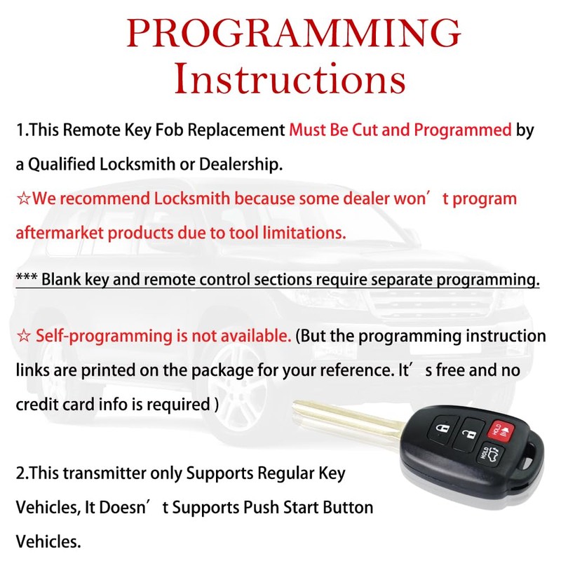 This Remote Key Fob Replacement Must Be Cut and Programmed by a Qualified Locksmith or Dealership.)This Transmitter Doesn't Work on Push Start Button Vehicles and it only Supports Regular Key Vehicles.