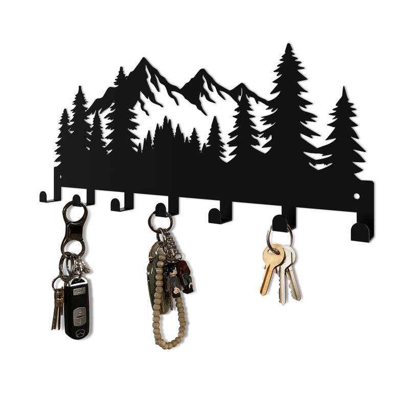 Key Holder Wall Mounted Key Hooks, Black Metal Key Rack Hooks, Grove, Mountain Theme Wall Decoration Hooks, With 7 Hooks, Applicable to Front Doors, Lobby, Corridor, Offices (12 x 5.98 Inches)