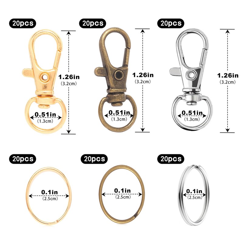 • Size: 60 pieces carabiners and 60 pieces key rings, 3.2 cm/1.28 inches, diameter of the split ring: 2.5 cm, 20 per colour.