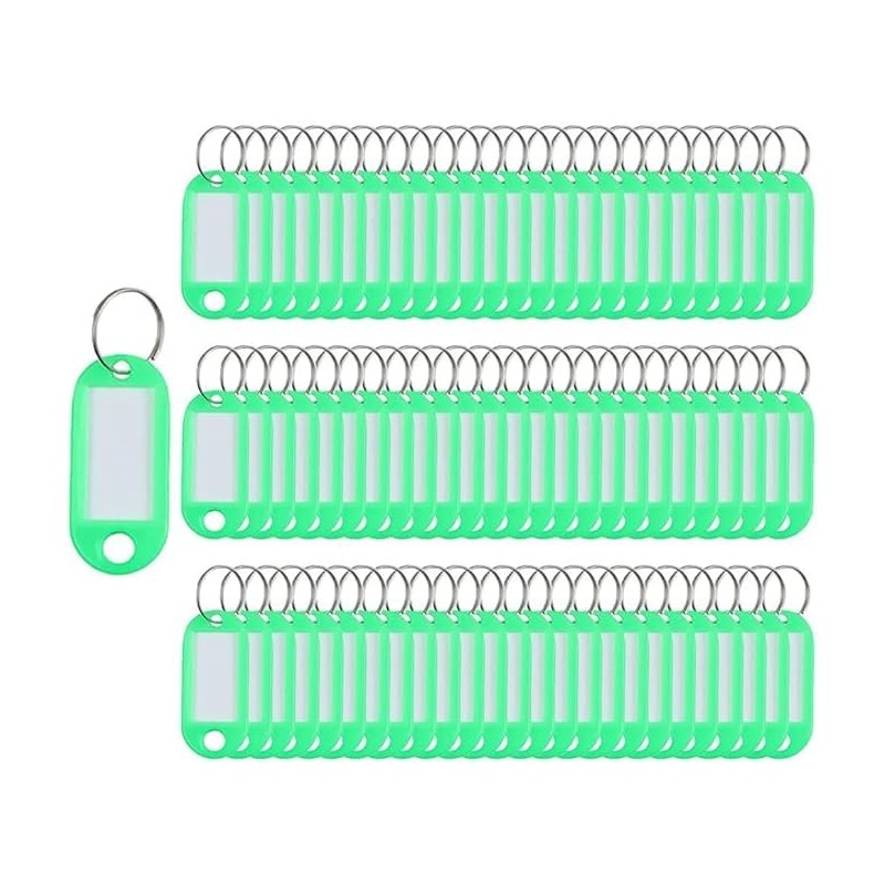 Key Tags with Split Ring, 100 Pack, of one Colour, Plastic ID Labels, 5 cm x 2.2 cm (100 Green)