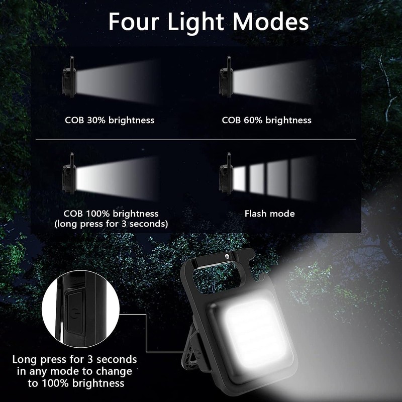 - 【High Brightness & 4 Lighting Modes】500mAh lithium battery, charged for 1.5 hours, can be used continuously for 2 hours (100% brightness); 3 hours (60% brightness), 4 hours (30% brightness) and 5 hours (flashing).Switch modes according to your different needs. The keychain light is designed with 4 brightness modes to adjust. COB 60% brightness, COB 30% brightness, COB strobe and long press the power button 3 seconds to brightest.