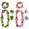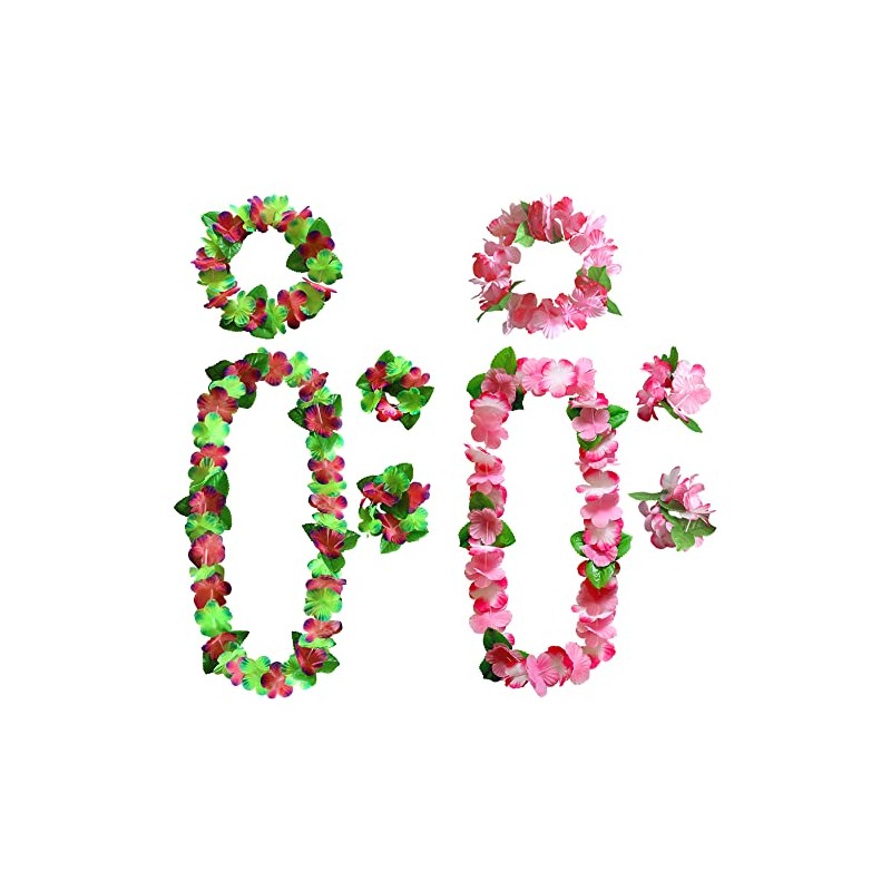KEYIDO Hawaiian Lei Garlands Set, Green Purple Pink Hawaiian Flower Necklace Headbands and Bracelets, Flower Garlands with Green Leaves, Hawaiian Tropical Theme Fancy Dress Party Decorations, 8 Pack