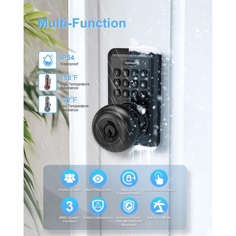 • Digital door lock with keypad set: The door knob with keypad is made of heavy zinc alloy instead of light weigh aluminum alloy, stable structure, sturdy cylinder, IP54 weather resistance, meet ANSI Grade 3 requirement, The door handle with keypad offering a long-lasting and secure solution for your door, and enhanced protection and peace of mind for your loved ones.