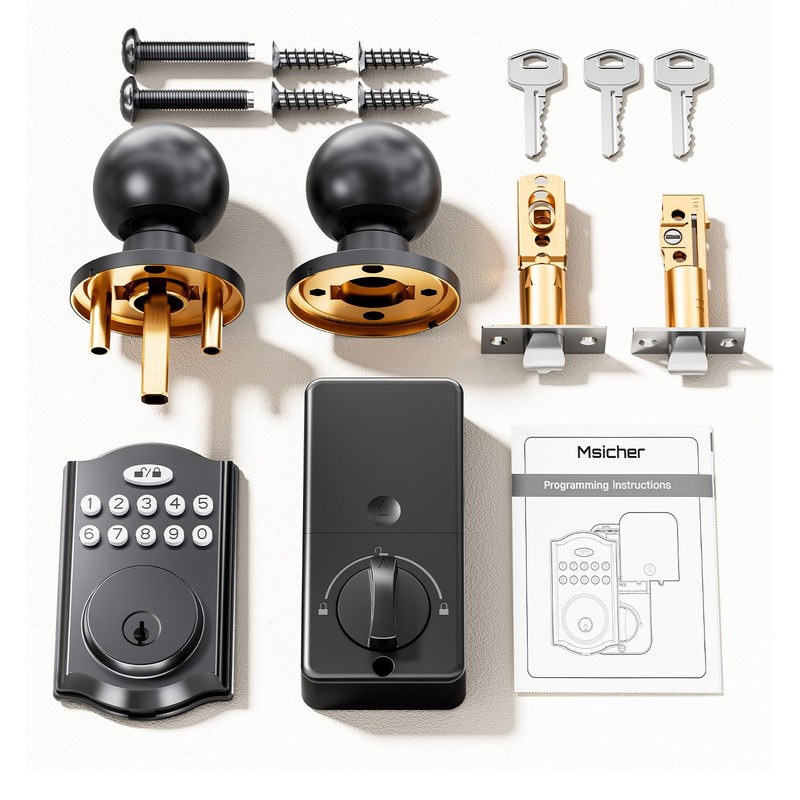 - Handle-Style Keypad Door Lock: Combines an electronic lock mechanism with a dual-knob design, featuring anti-snooping passwords, a backlit keypad, low-battery alerts, silent mode, and vacation mode. Powered by 4 AA batteries (not included) with up to 16 months of battery life. Low-battery warnings and emergency power options prevent lockouts due to dead batteries.