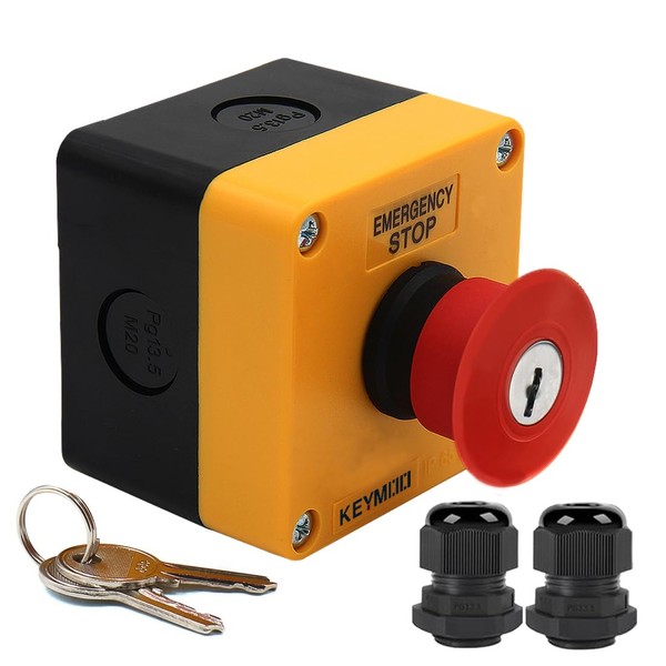 KEYMOO Emergency Stop Push Button Switch with Key Lock, 1NC 10A 660V with Waterproof Box IP65, with 2pcs PG13.5 Black Connectors