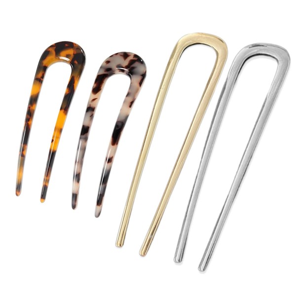 KEYRI 4 PCS French Hair Pins U-Shaped Hair Pins Delicate French Twist Pins for Variety Occasions Gold and Silver Hair Clips Dark and Light Tortoiseshell Clips for Women and Girls (Metal and Acetate)