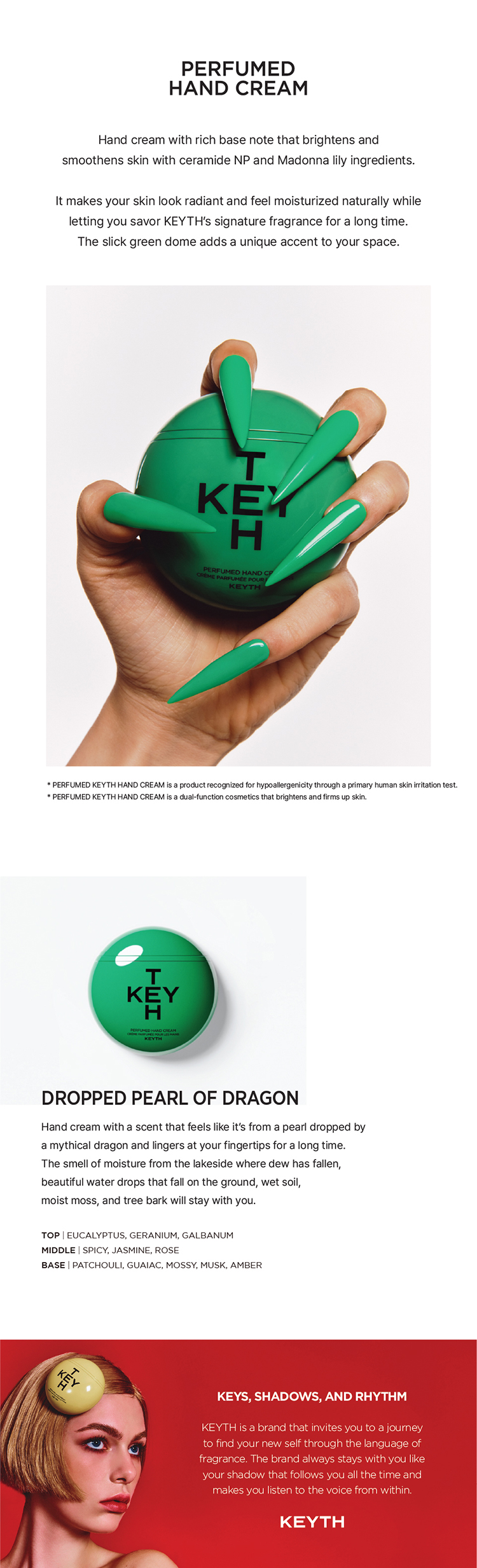 Provides seamless glow and moisture while enjoying KEYTH's signature scent for a long time. Has a moist grass scent felt by the water. A scent that feels like the jewel dropped by the dragon in a snow-covered lake. The combination of Eucalyptus Globulus, galbanum, patchouli, and Gaiac wood gives the air a moist feel by the lake. It is a low-irritant product that has passed a skin primary irritation test. A product that meets the Clean at Sephora harmful ingredient standards. Dual functional product for skin brightening and anti-wrinkle. Inspired by a journey of exploring materials to create a single fragrance, as if opening doors one by one with a key.
