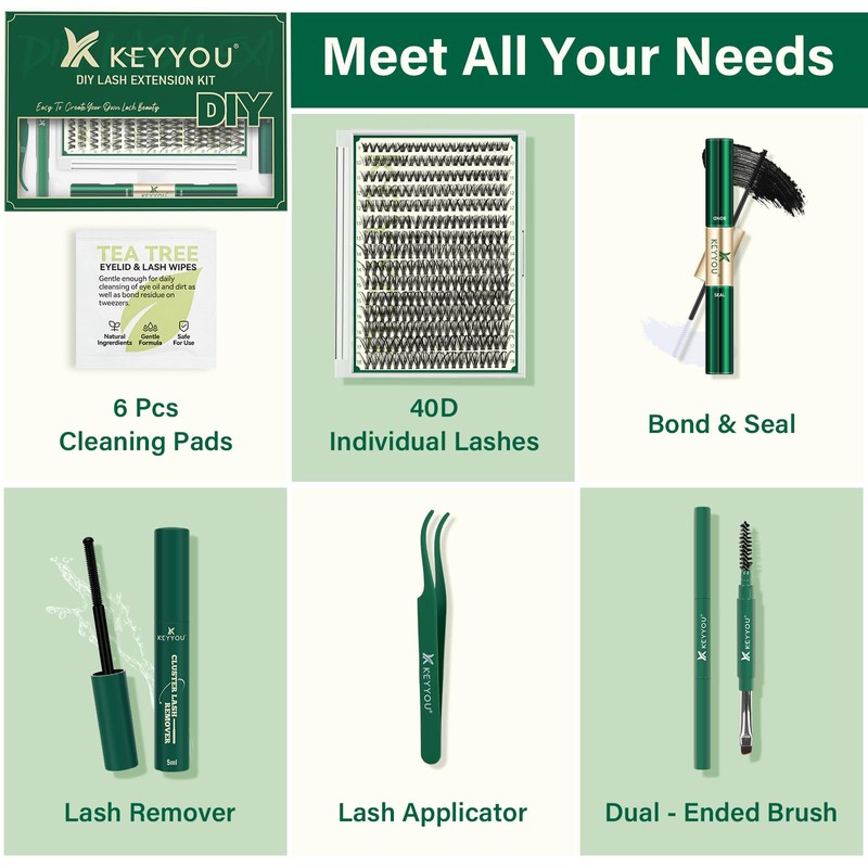 - What It IncludesKEYYOU DIY lash extension kit comes with pcs high quality lash clusters,ML Lash bond and seal,ML lash remover,one lash applicator,one lash brush and pcs cleaning pads to meet all your needs.