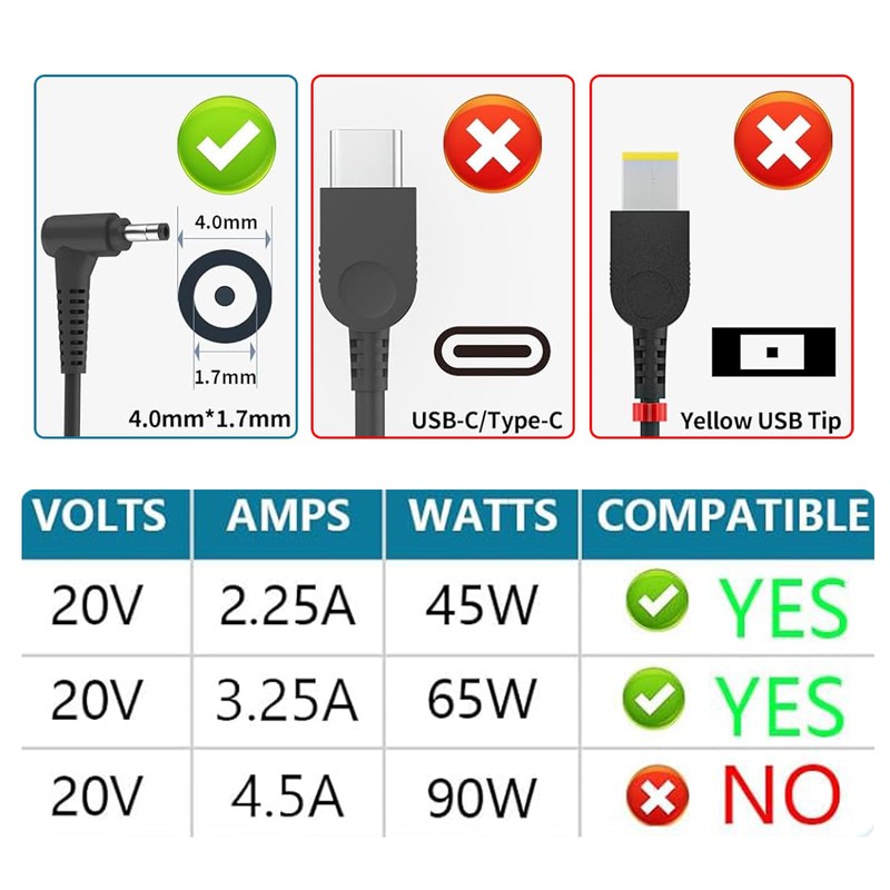 - Input: AC 100-240V ~50/60Hz; Output Range: DC 20V 3.25A 65W Max. Compatible with DC 20V 2.25A 45W; connection size: 4.0 mm x 1.7 mm (round tip! Please carefully check the parameters of your computer!)